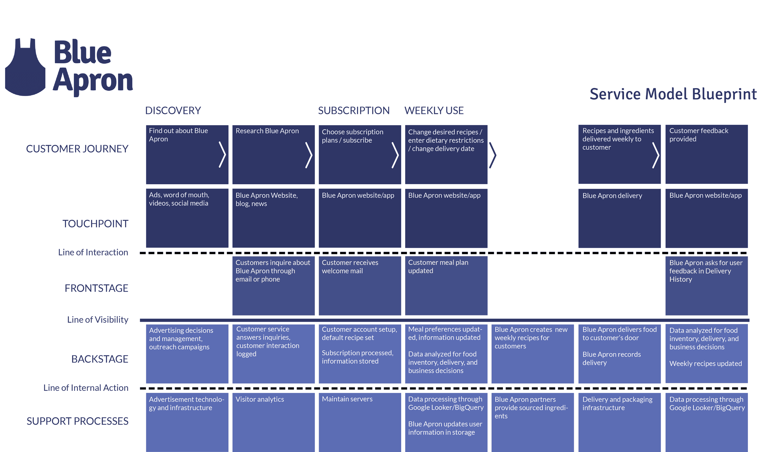 As part of my service design class, I analyzed and created Blue Apron's business canvas model and service design blueprint.