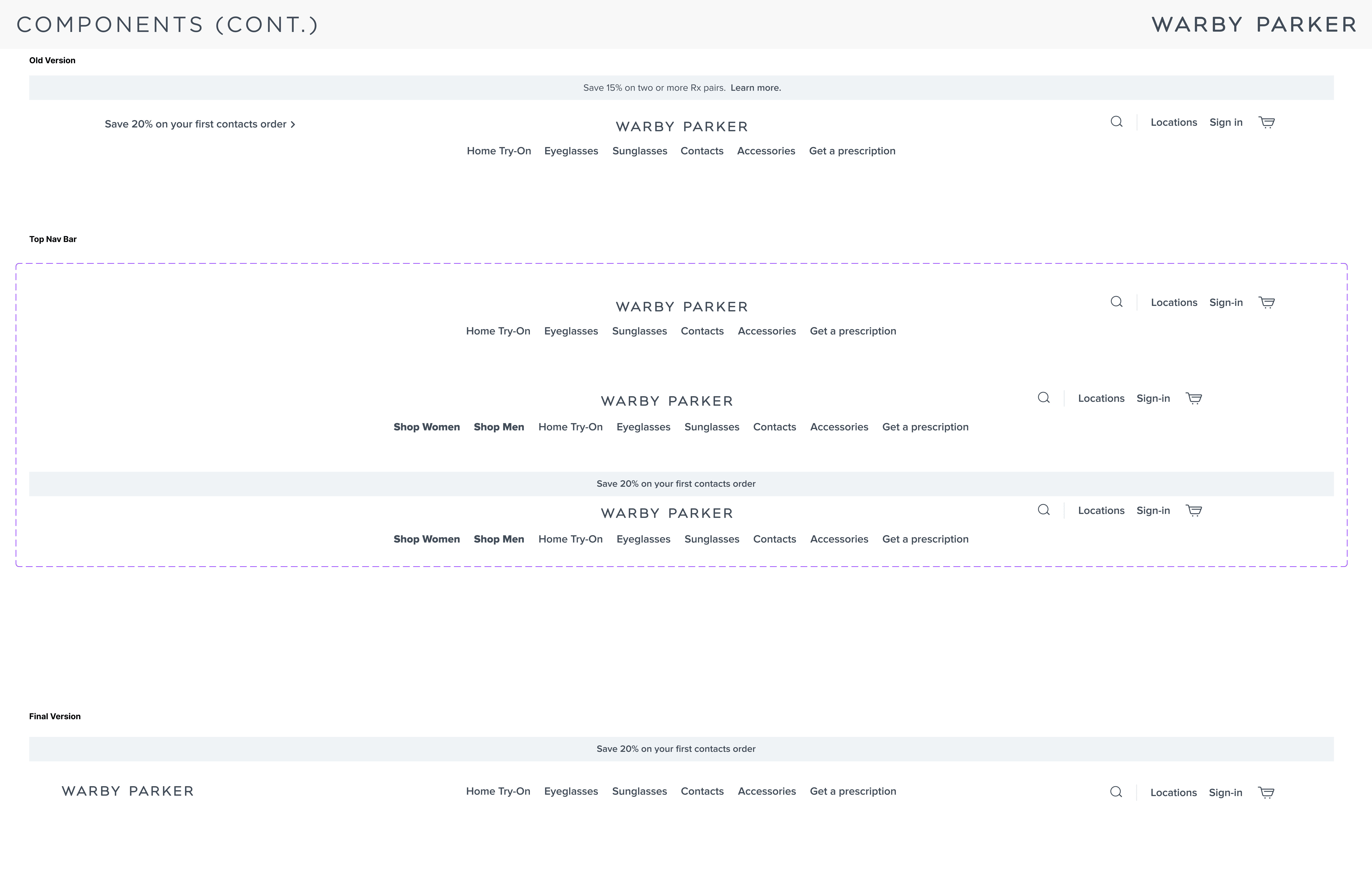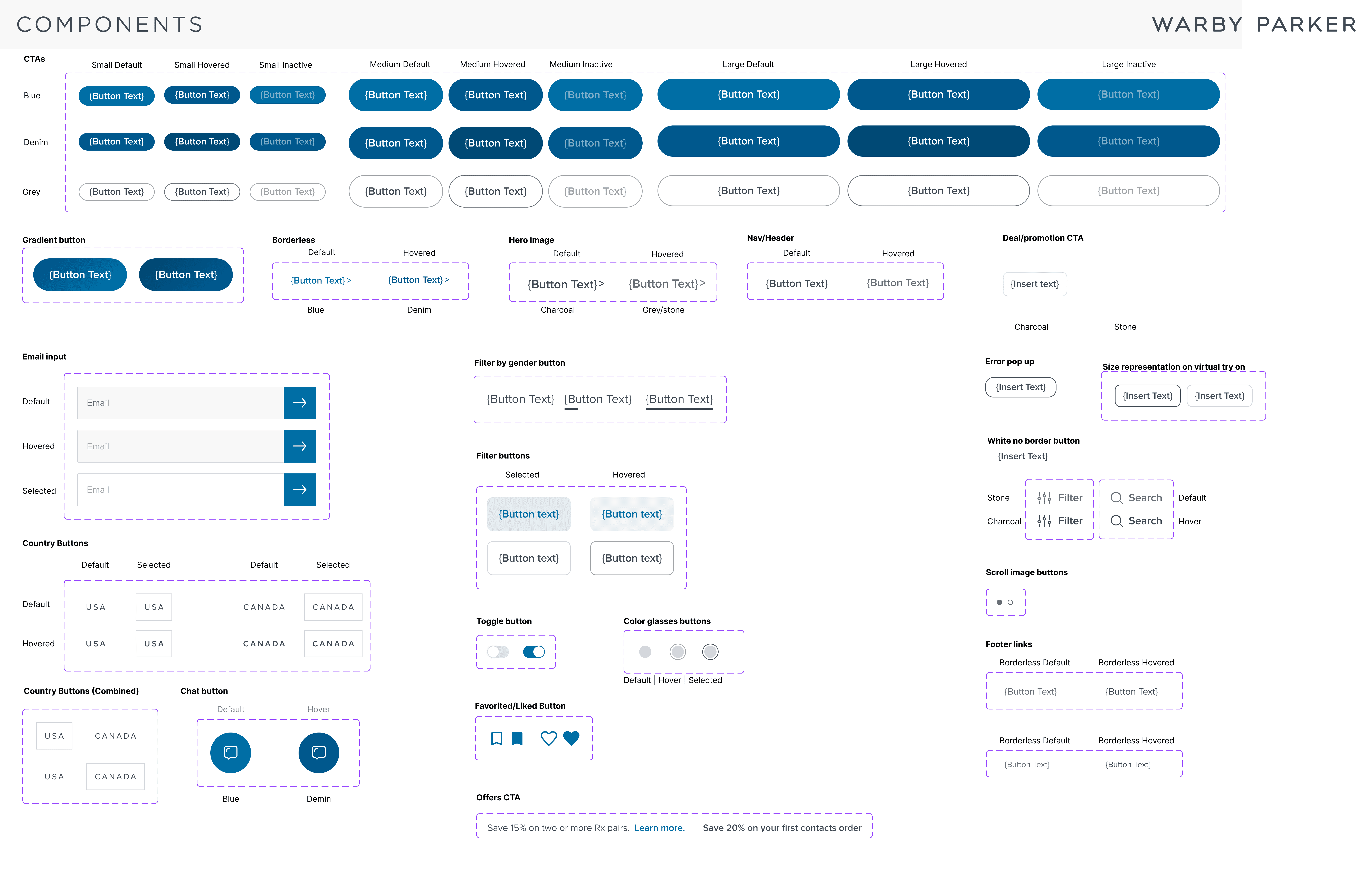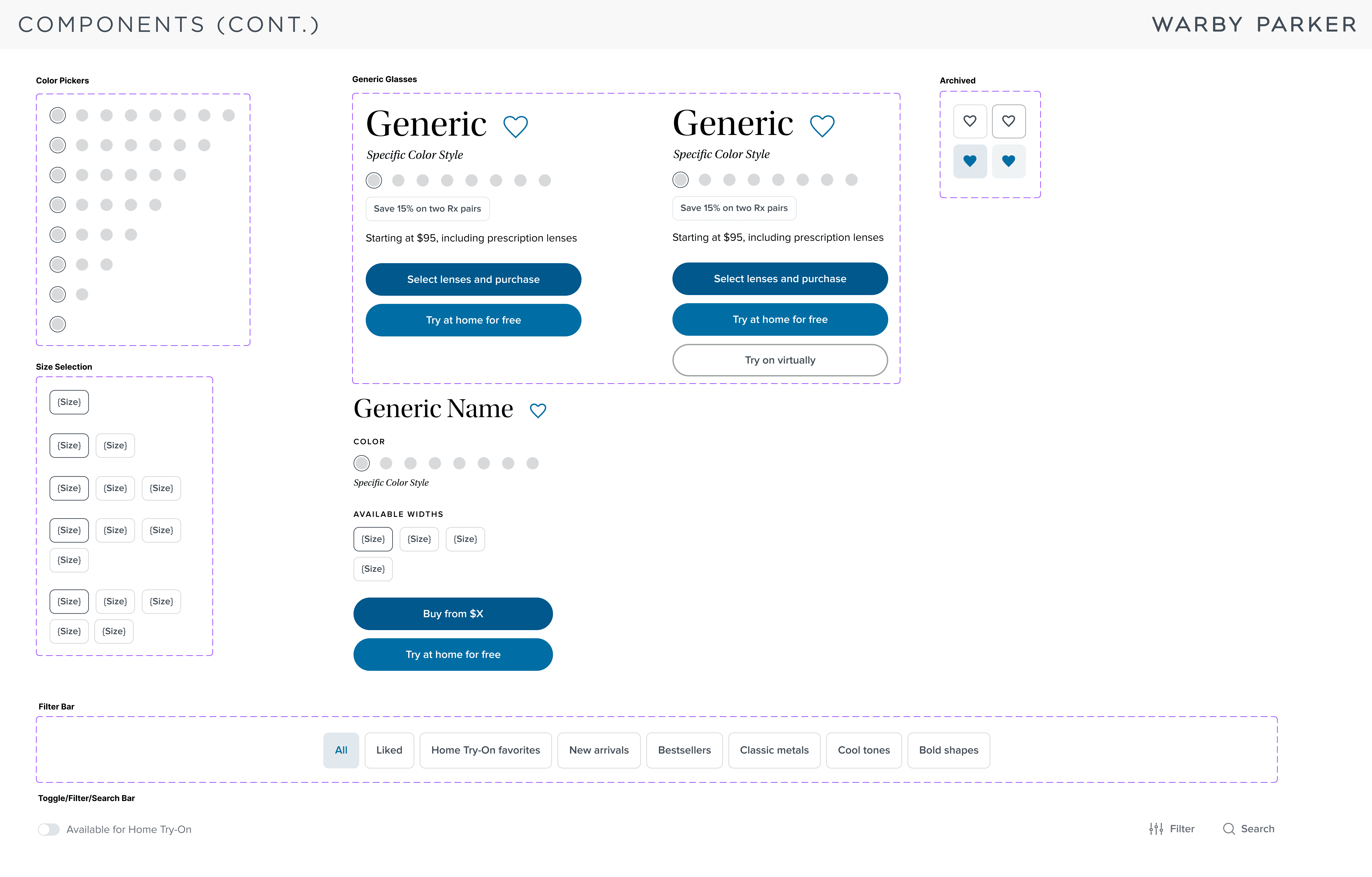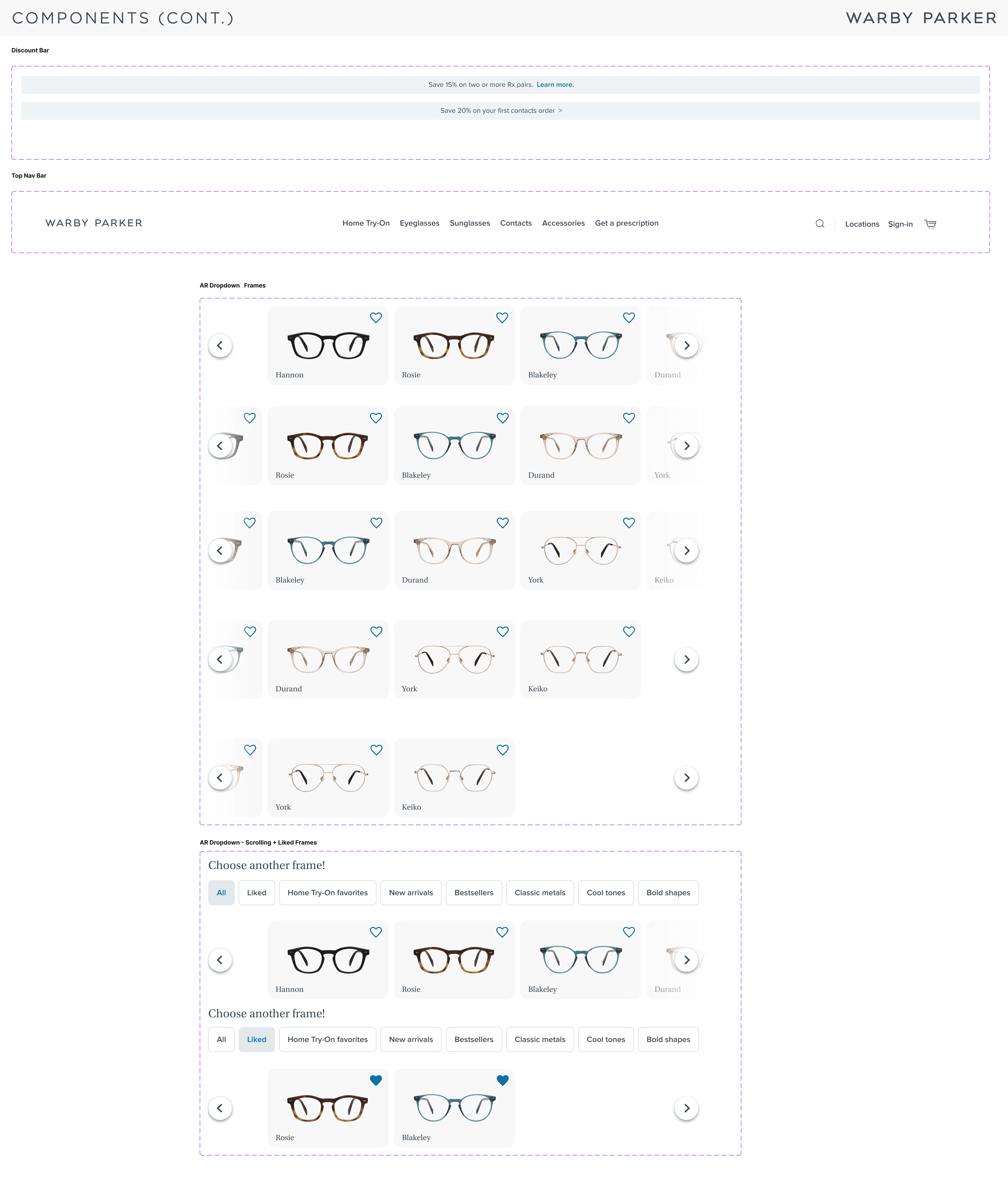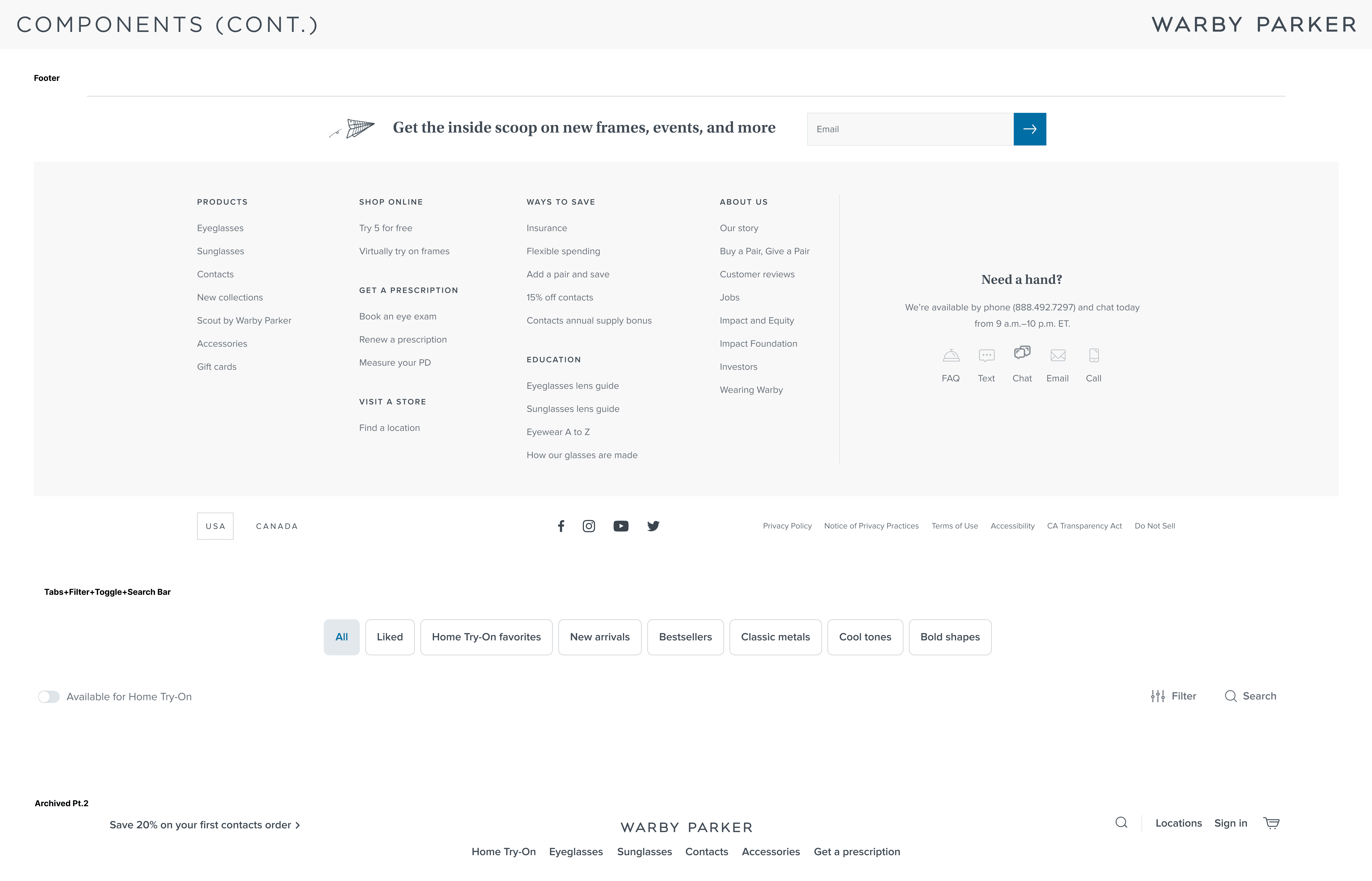 I collaborated with Katherine to understand and build out Warby Parker's existing design system to the best of our abilities as well as create components that would serve as the building blocks to our prototype. You can see more of our design system below.