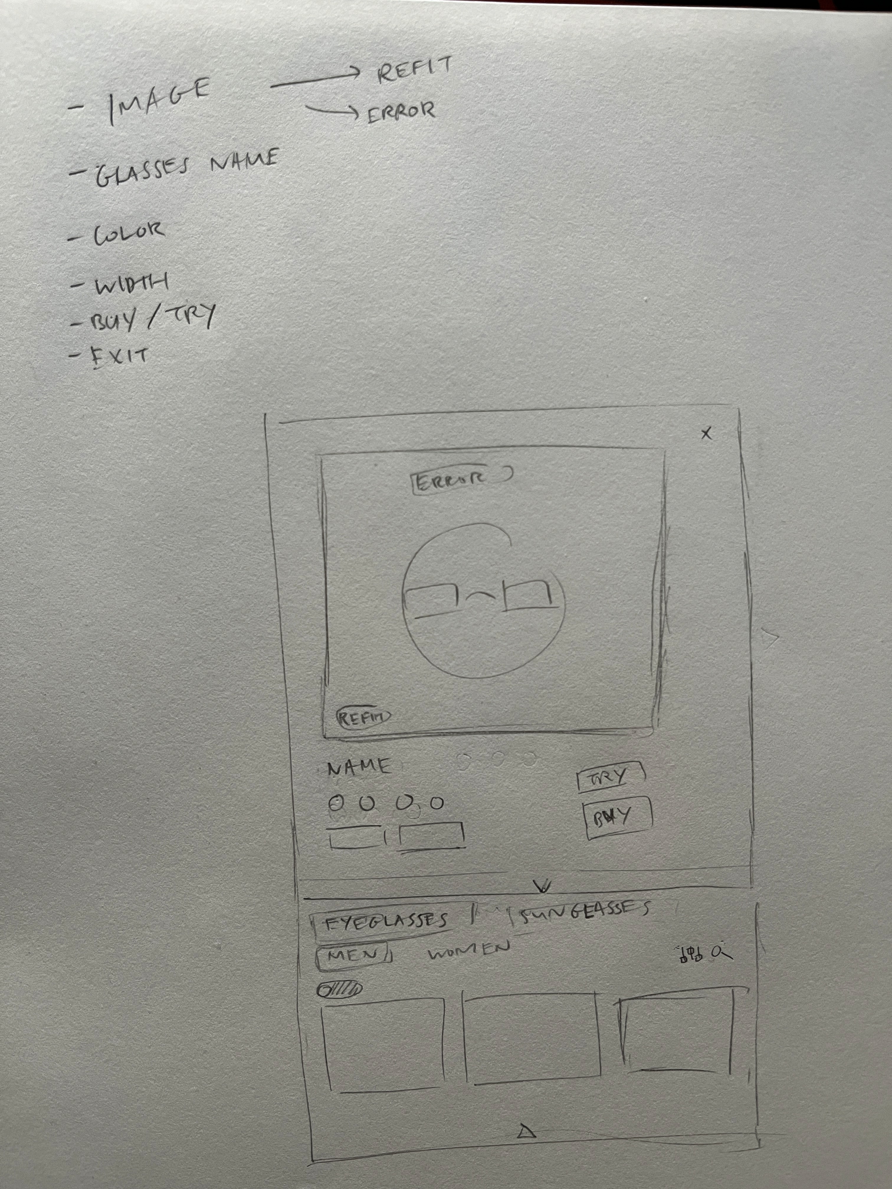 Our sketches were rough approximations of the native in-site web apps we wanted native to the overall Warby Parker site. The two sketches laid the ground work in our design process. In the end, we opted to use most of the features of the sketch on the left for its simplicity and clear design, an upgrade from the current Warby Parker user experience.