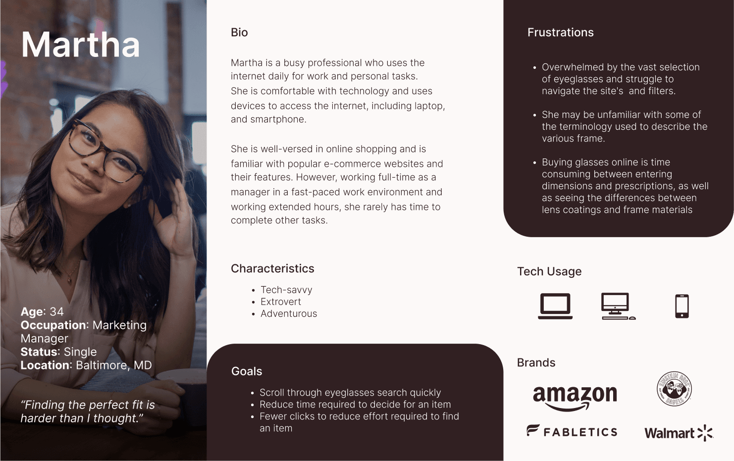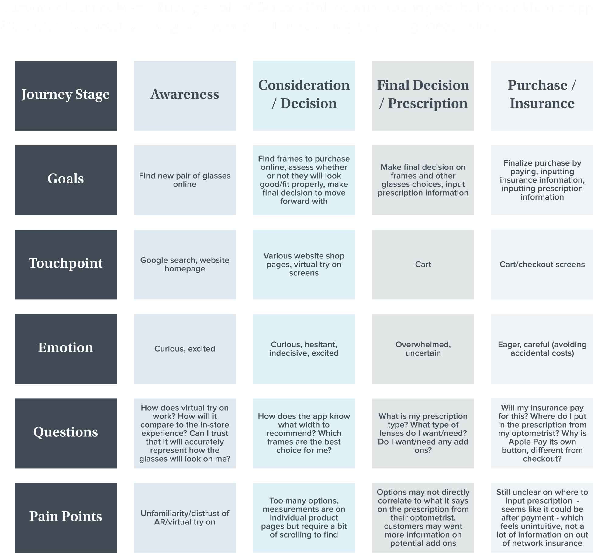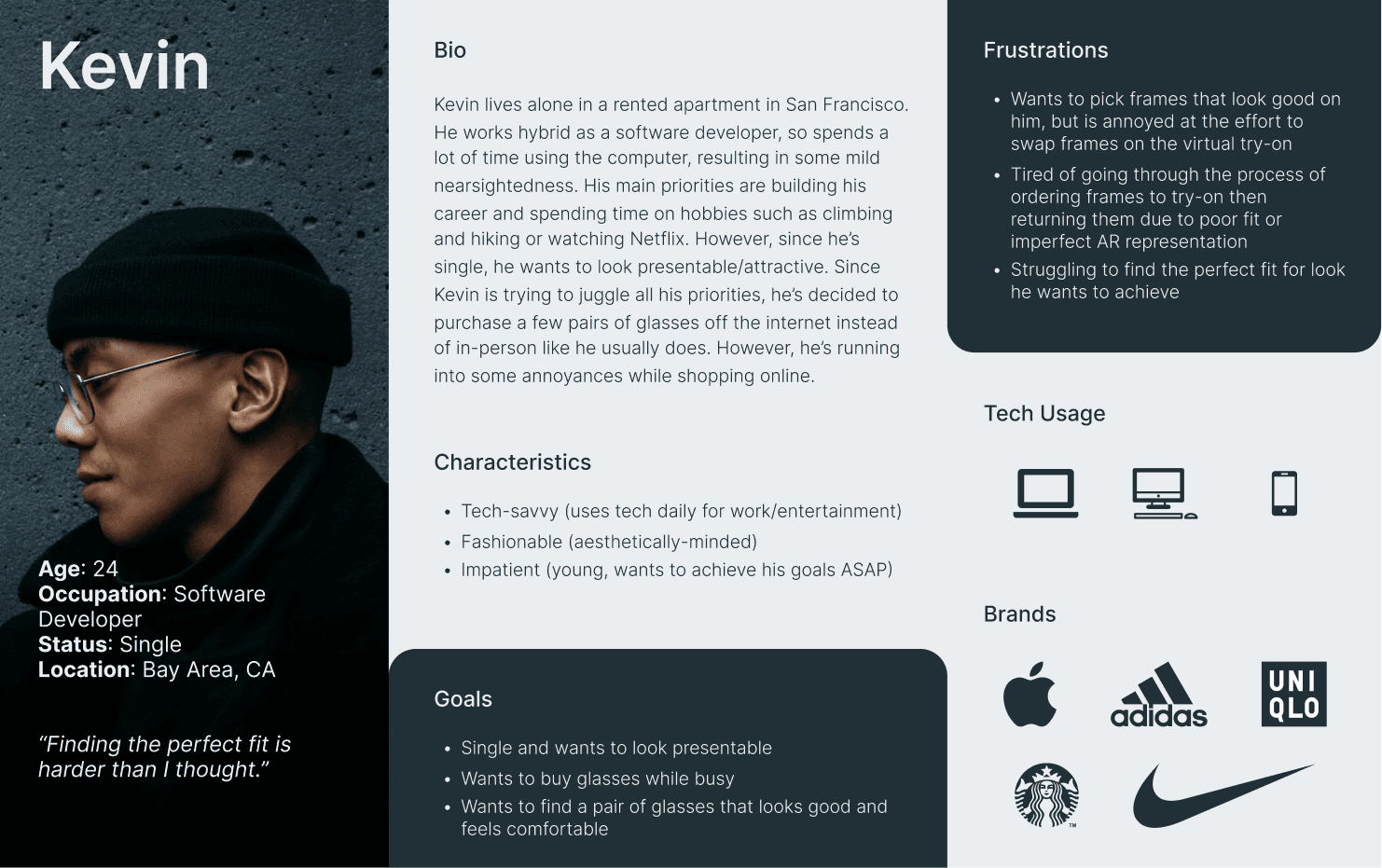 Our team explored the glasses space of e-commerce since AR technology has already been quite prevalent in this area, and identified a few pain points that users had regarding online shopping.